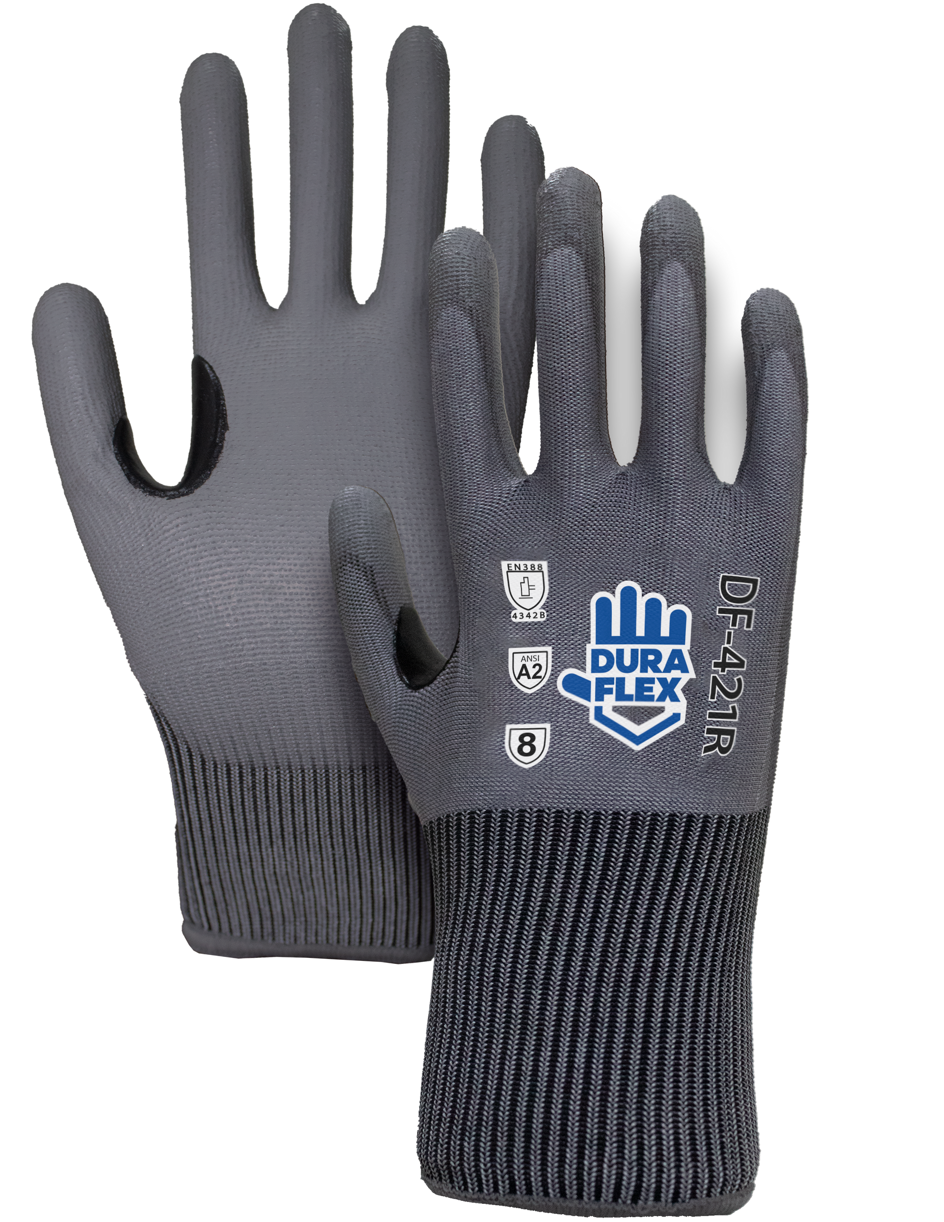 Blend de polietileno y fibras sintéticas, con recubrimiento de poliuretano gris en palma y TCR entre dedo pulgar e índice.
